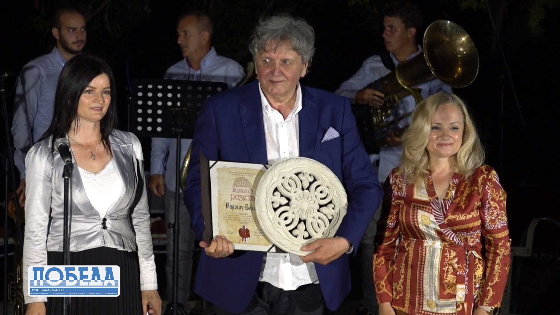 -Nizu dobitnika koji posebno promovišu ovaj kraj, iz koga i sam potiče, pridružuje se i glumac, scenarista i reditelj Radoš Bajić. Pored glumačkog opusa, njegovu uspešnu i bogatu profesionalnu karijeru obeležavaju i osvedočeni rezultati kao autora i producenta. Značajan doprinos afirmaciji naših kulturnih vrednosti, Bajić je dao i u oblasti književnosti i novinarstva. Večeras je ponovo sa nama i ja osećam samo zadovoljstvo i sreću što mogu da mu uručim nagradu i da ga pitam kakve su prognoze za leto, da li će selo ponovo da gori, makar na televiziji i da li imamo dobru konkurenciju među babama za češljanje? Ili je – da ga citiram, „propala stvar načisto“?“, završila je gradonačelnik Palurović.